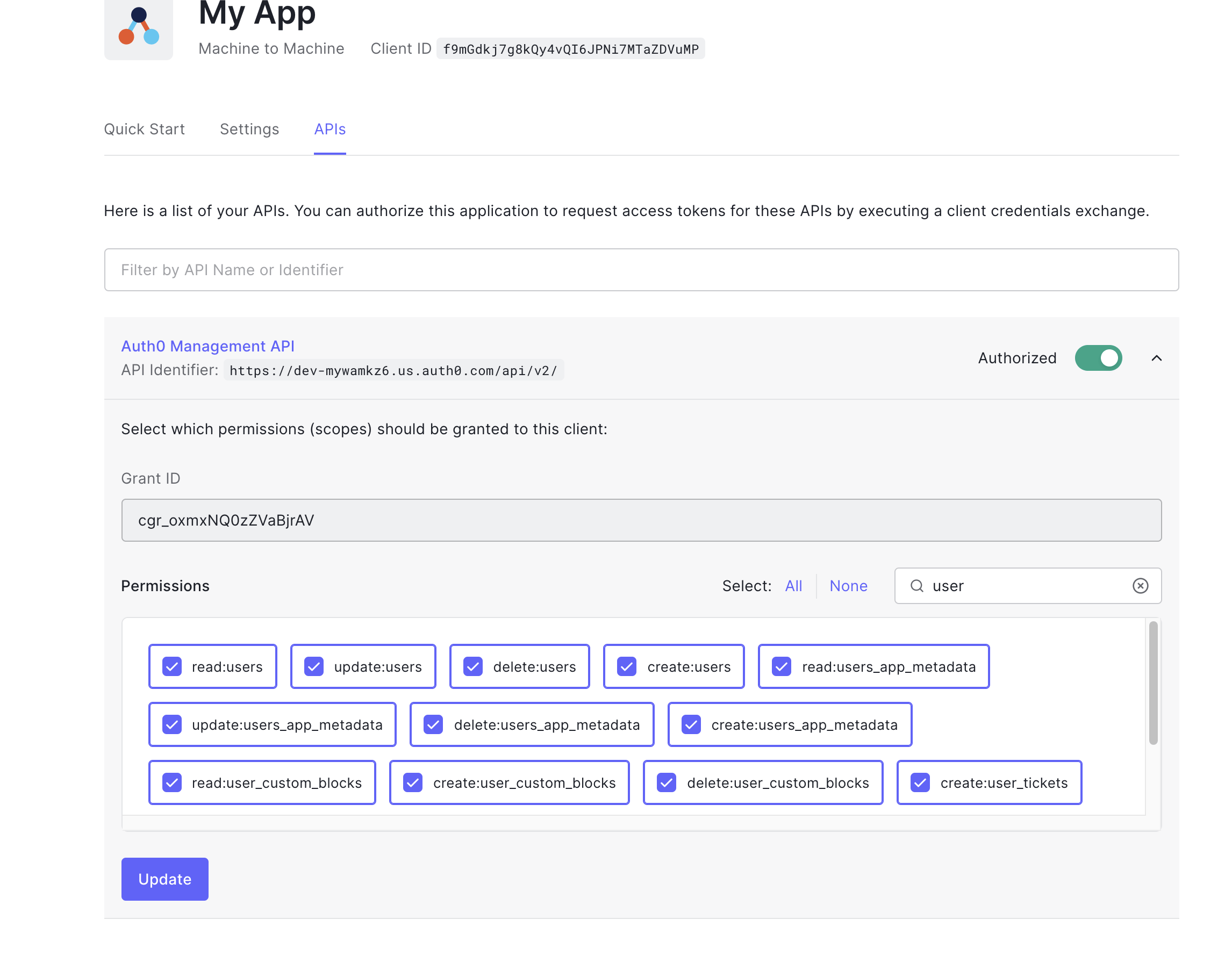 read:user_idp_tokens for identity provider access. Make sure to hit Update.