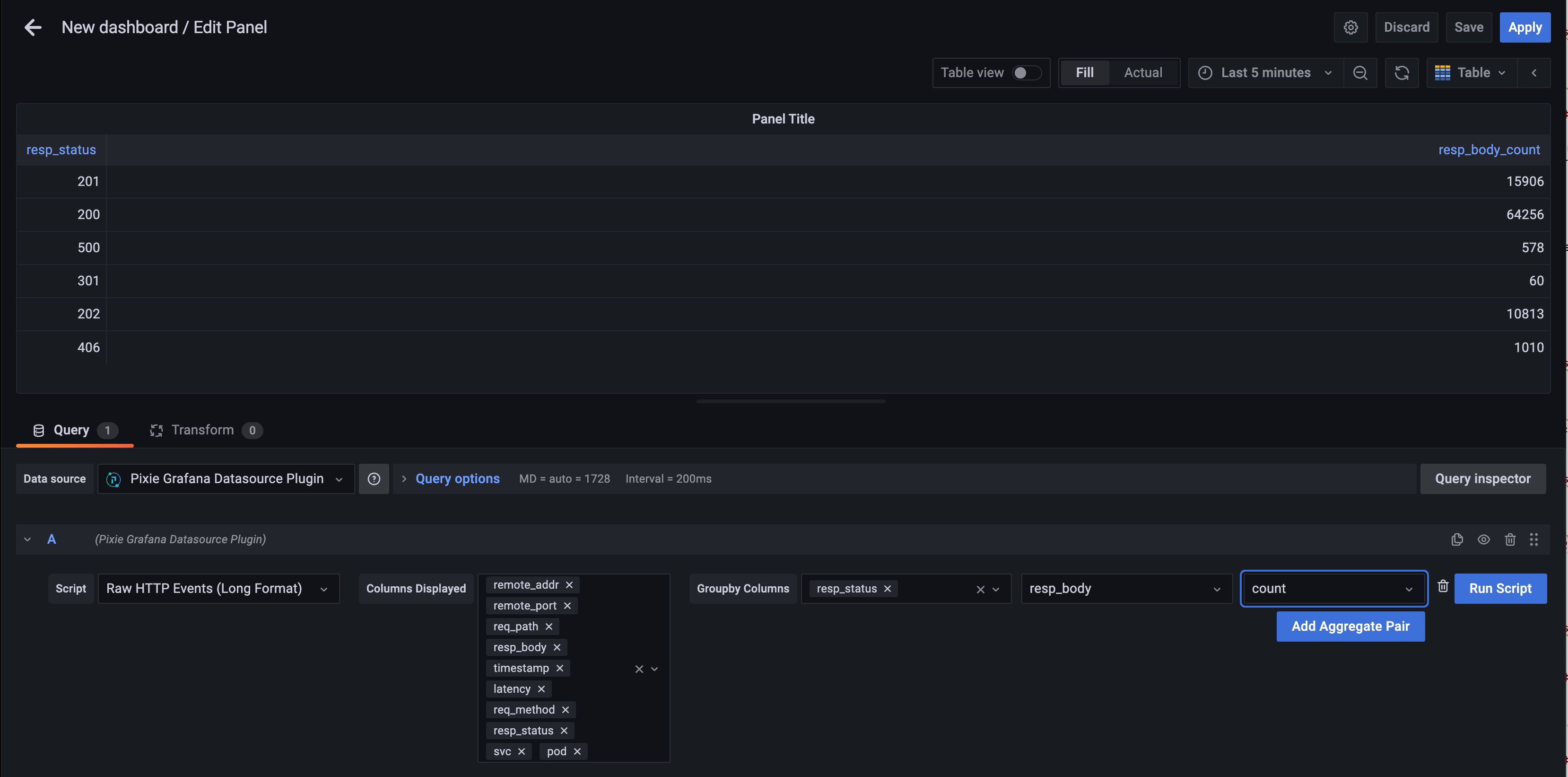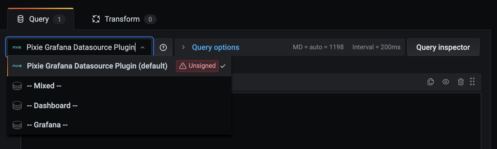Configure the query by selecting the Pixie Grafana Datasource Plugin from the data source selector.