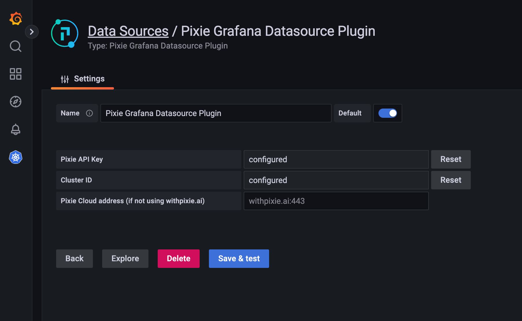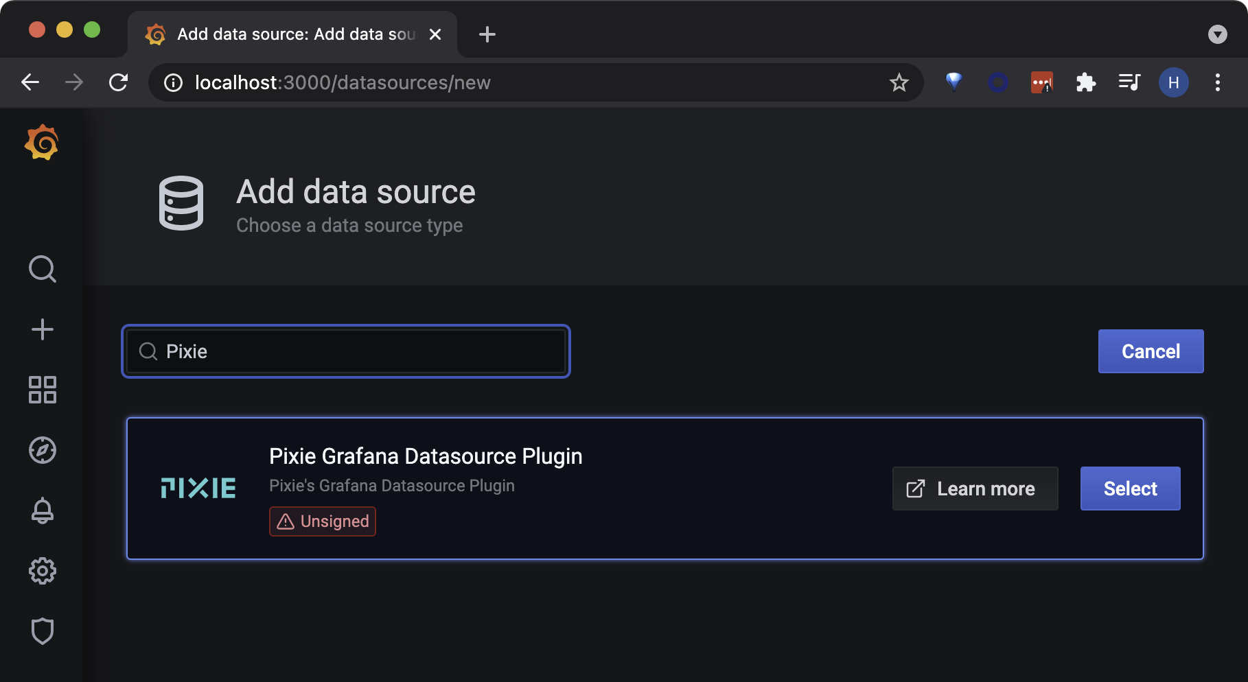 Search for "Pixie Grafana Datasource Plugin" and press the Select button. The datasource configuration page will open.