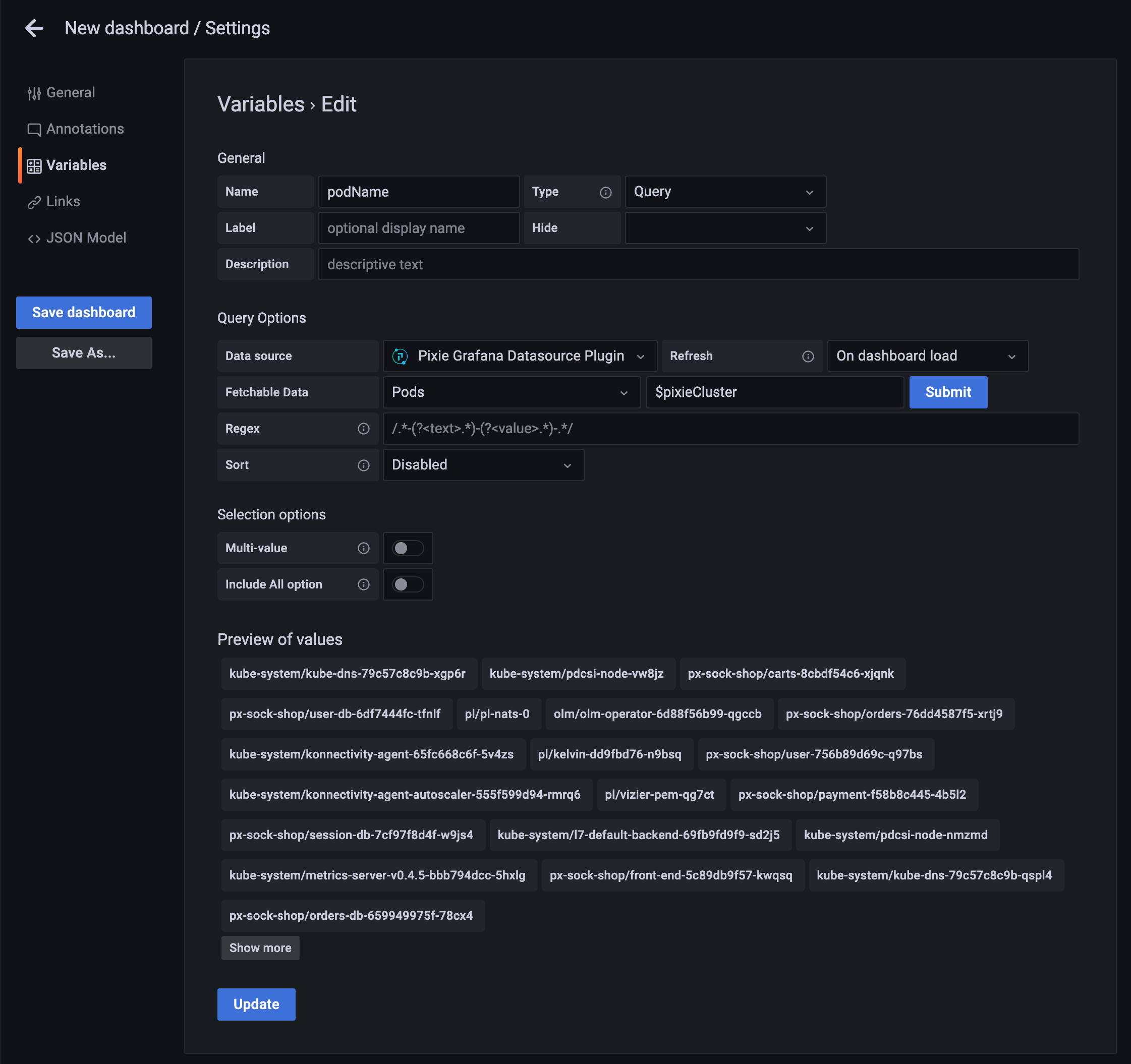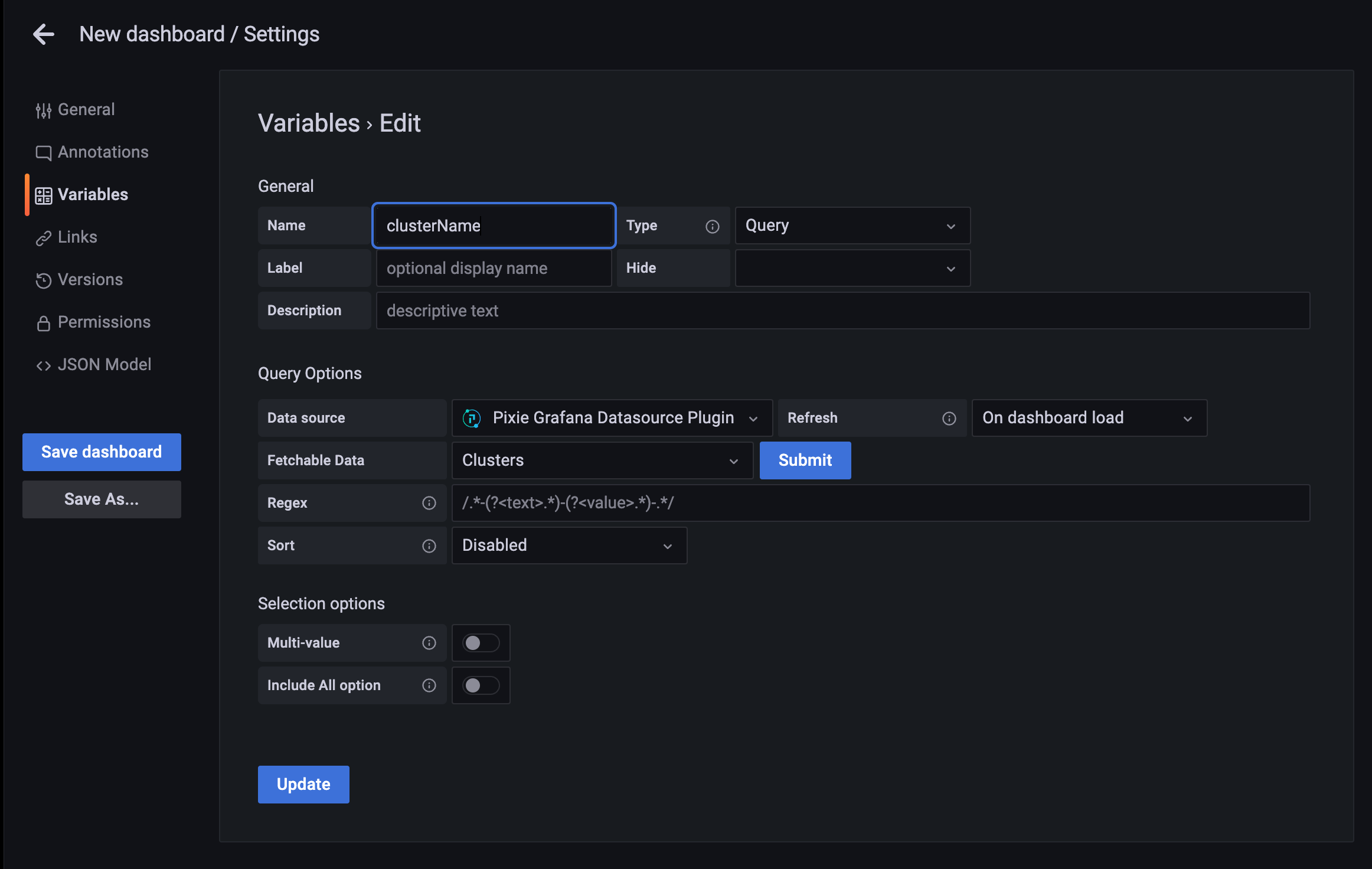 If you have Pixie installed on more than one cluster, you can create a pixieCluster dashboard variable to view data for any cluster in your Pixie organization. If you do not create a pixieCluster dashboard variable, the plugin will default to showing data for the Cluster ID specified when configuring the Pixie Datasource.
