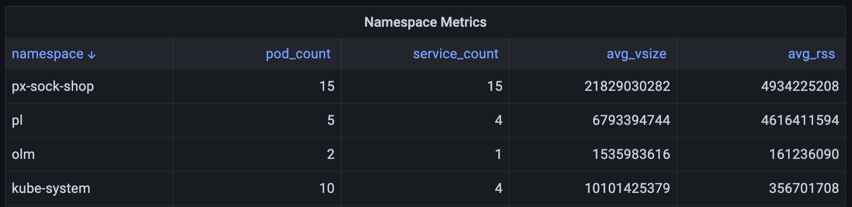 Use the Namespace Metrics script to see high-level metrics for each namespace in your cluster: