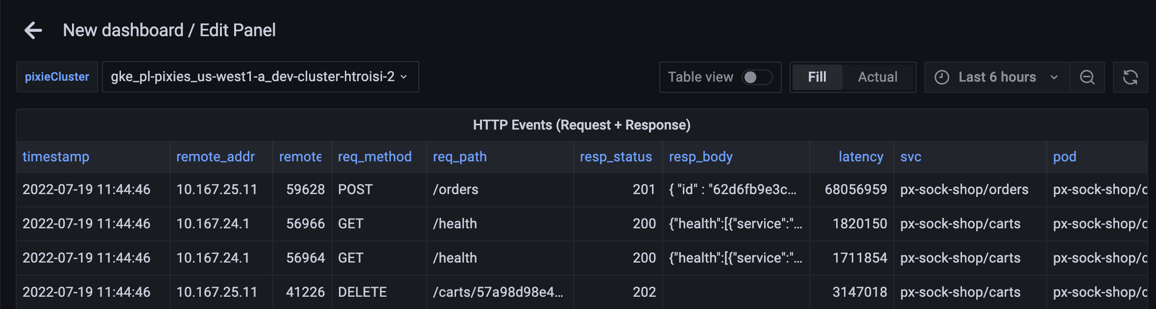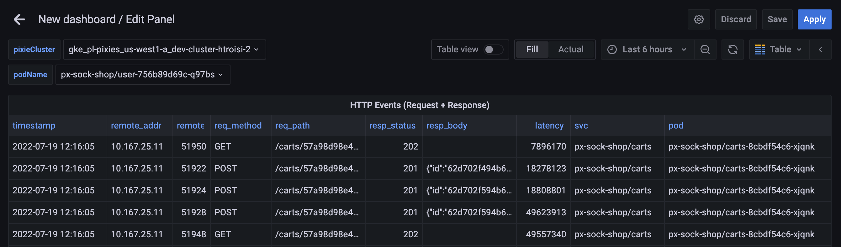 podName drop-down menu above the panel will now filter the results to only include HTTP requests made to the selected pod.