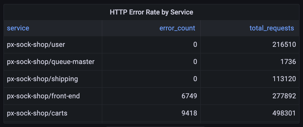 Use the HTTP Error Rate by Service (Wide Format) script to see HTTP error and total request count for each service in your cluster: