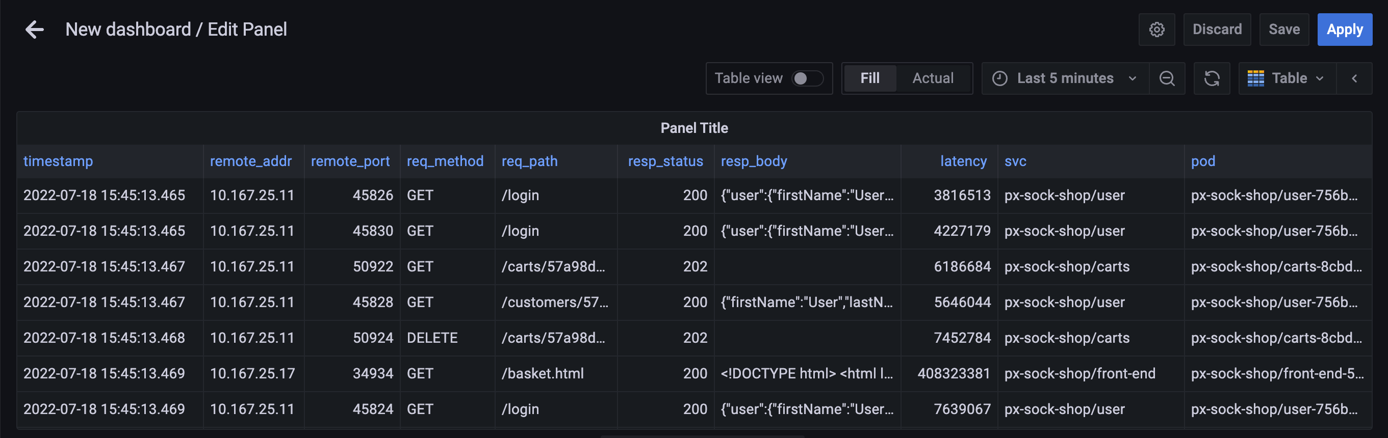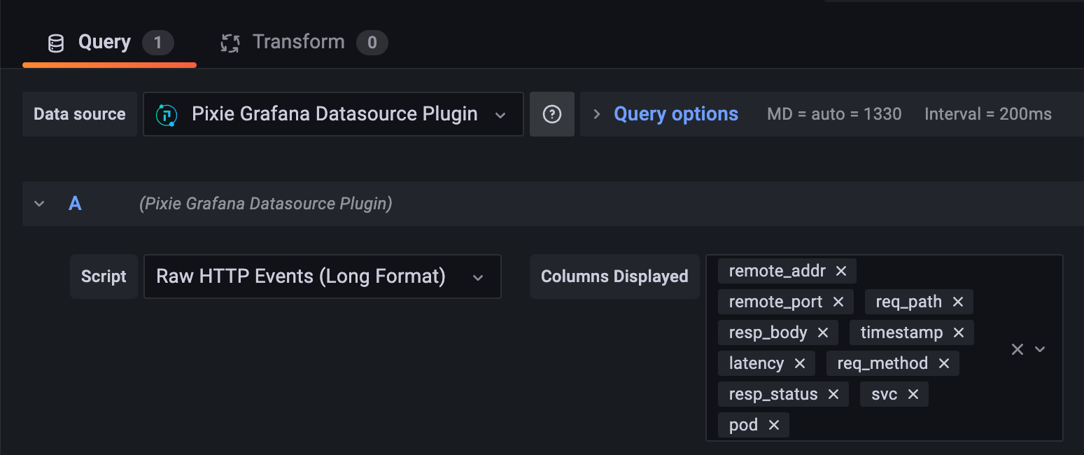 # Keep only the selected columns (and order them in the following order)df = df[[$__columns]]# Filter HTTP events to only include the ones made to the selected poddf = df[df.pod == '$podName']# Output the DataFramepx.display(df)