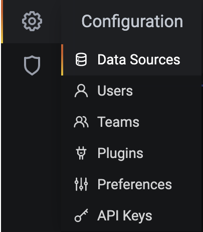 Click on Data Sources. The data sources page opens showing a list of previously configured data sources for the Grafana instance.