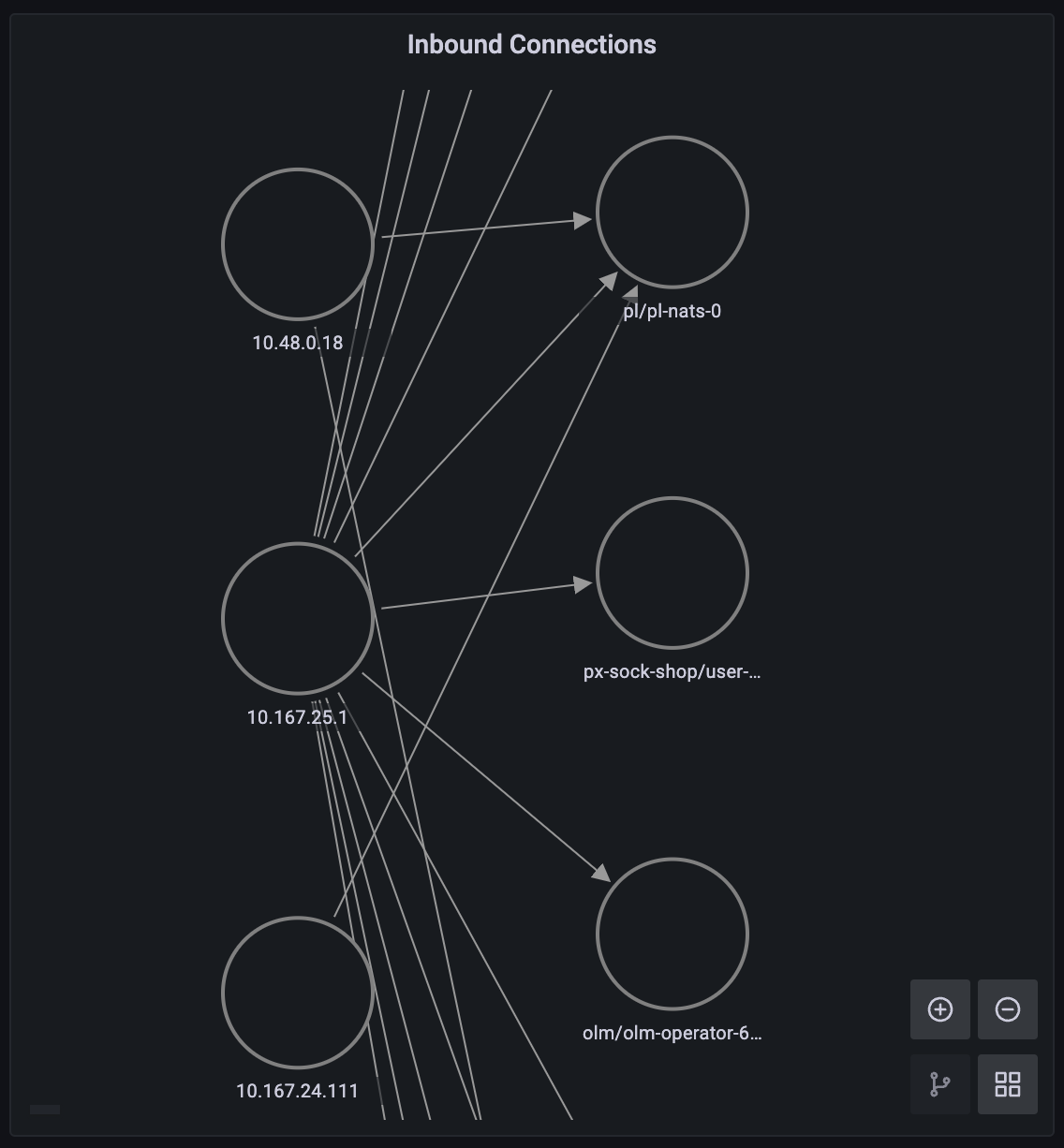 Use the Inbound Connections script to see inbound network connections to your cluster (connections made from external IPs). Note: this node graph panel requires Grafana version 8.0.0+.