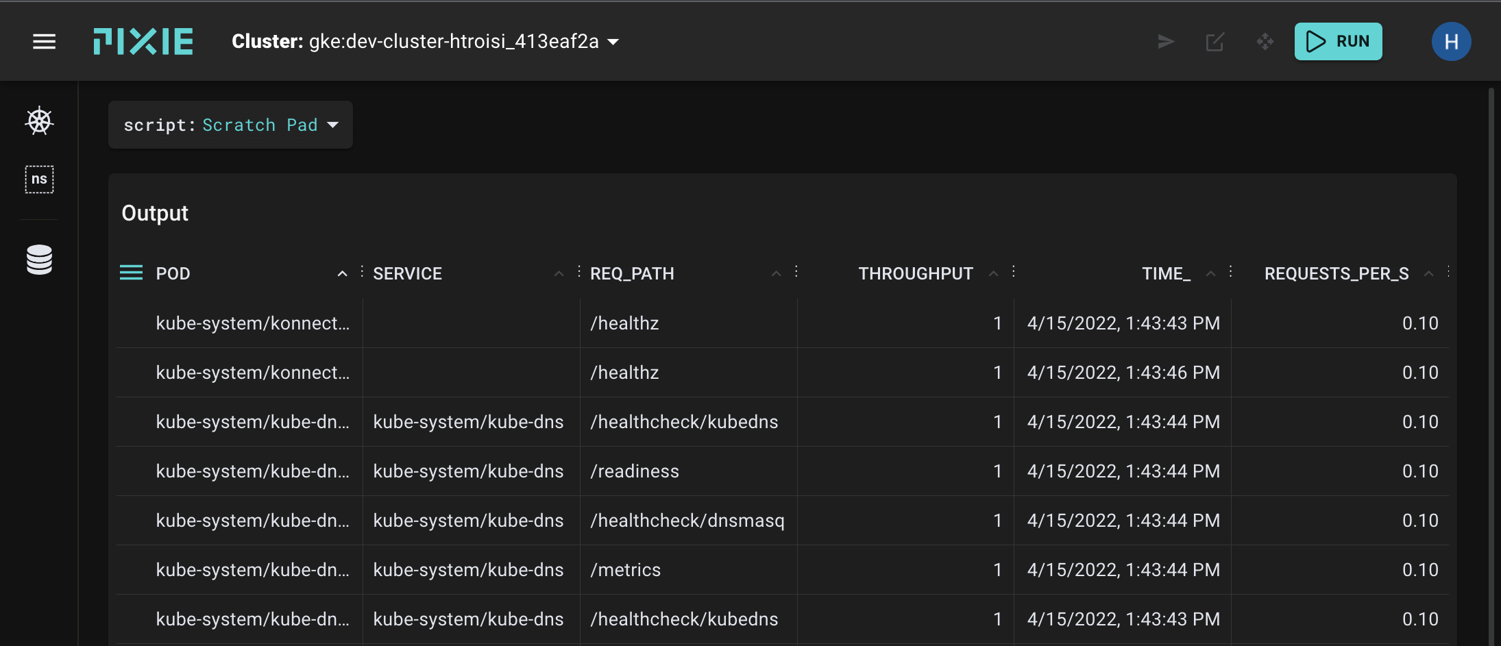 PxL scripts are used to query telemetry data collected by the Pixie Platform. Our PxL script will also export the Pixie data in the OTel format. We'll use the Live UI's Scratch Pad to develop our PxL script.