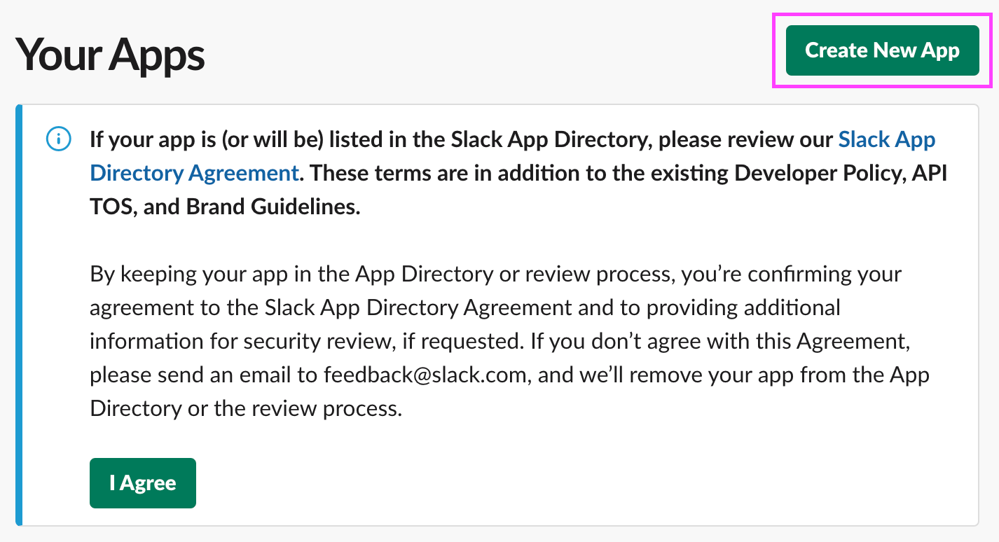 First, you'll need to create a Slack App, which will allow our application to post messages in a Slack channel.