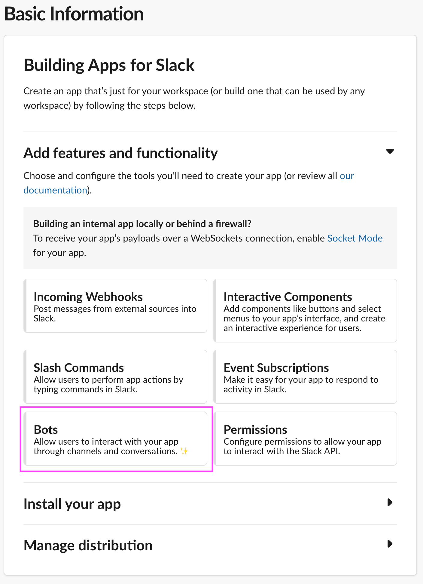 After creating the Pixie Alerts App, you'll be taken to the Basic Information page for the app. Under Add features and functionality, select Bots.