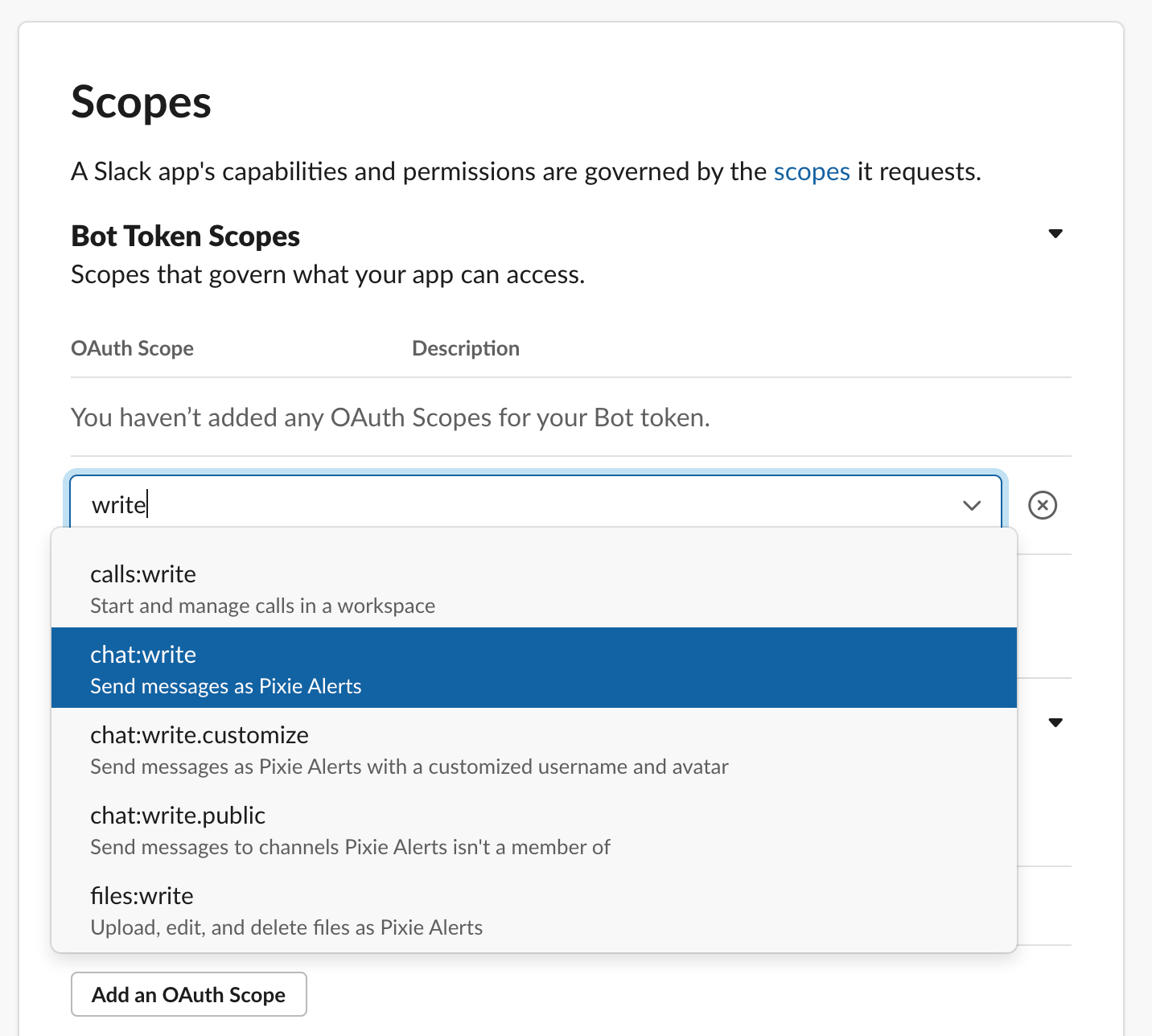 On the next page, scroll down to the Scopes section, select the Add an OAuth Scope button and then the chat:write option.