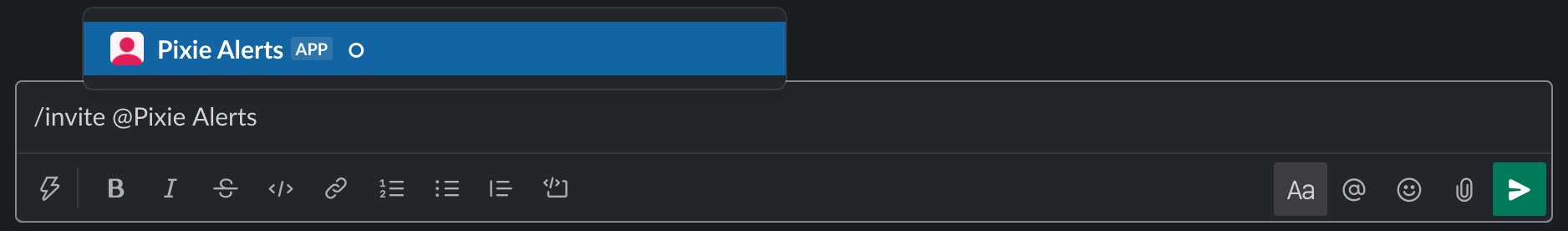 Invite the Pixie Alerts App to the channel, using /invite @Pixie Alerts.