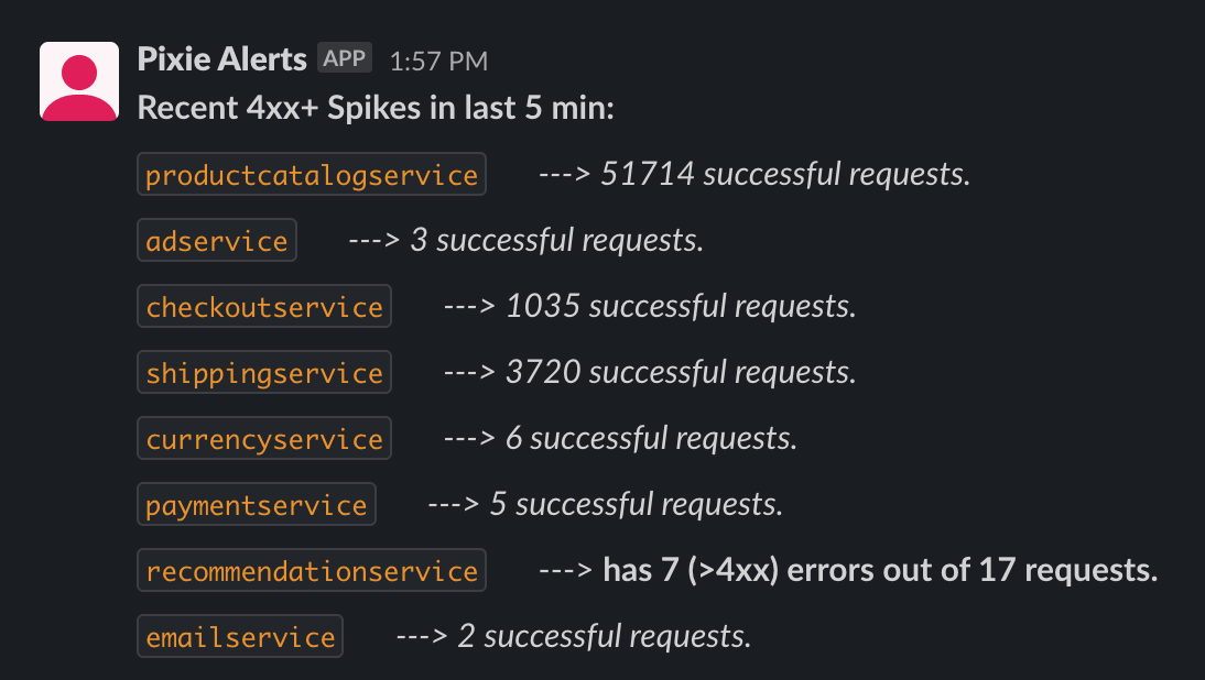 This tutorial will show you how to create a Slackbot to monitor your Kubernetes cluster using data from Pixie's observability platform. This Slackbot reports the number of HTTP errors per service in your cluster. However, the example code can be modified to alert based on any data available from Pixie.