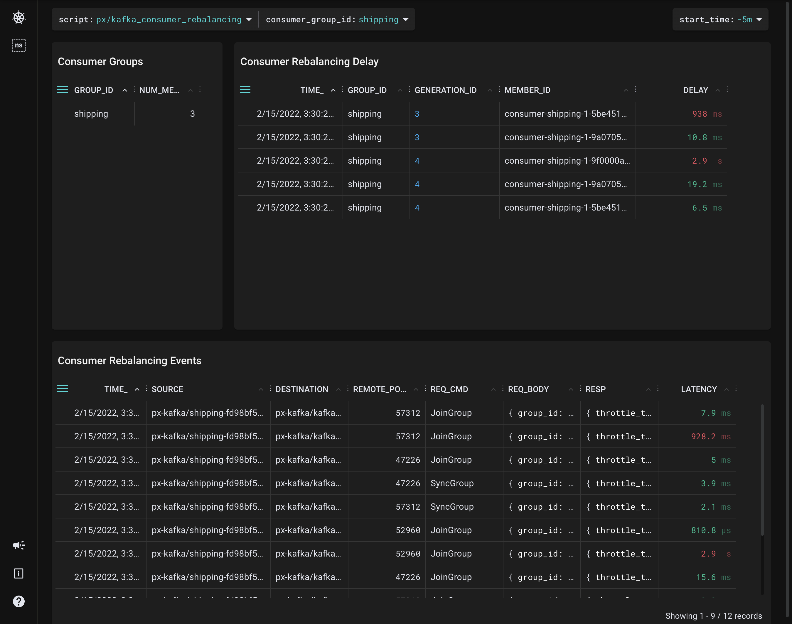 px/kafka_consumer_rebalancing from the script drop-down menu.This script visualizes the most recent Kafka consumer rebalancing events with their delays.