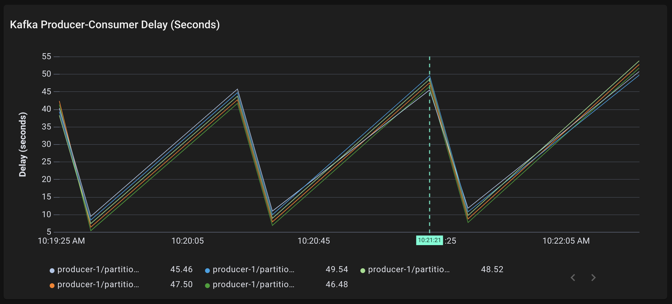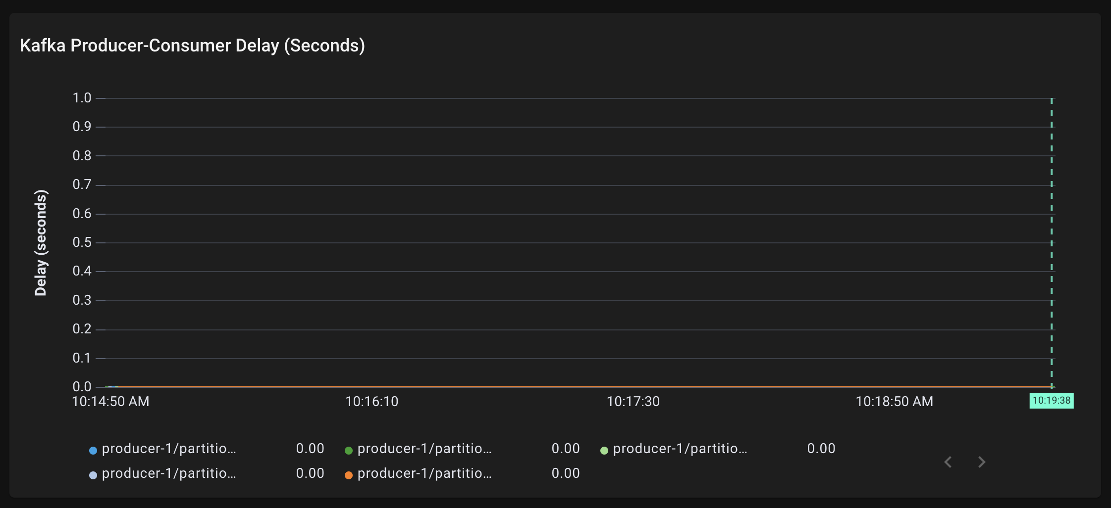 The Kafka Producer-Consumer Delay (Seconds) graph plots the delay between when the producer pushes messages to the