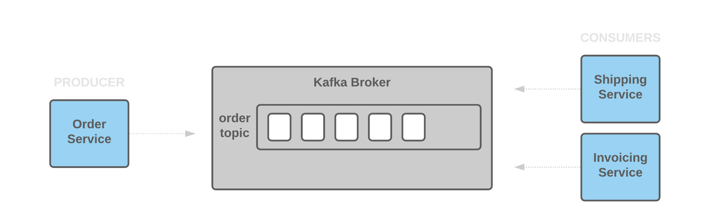 order service creates orders. This service publishes messages to the order topic.shipping service consumes the order topic messages and extracts the information needed to ship the items. This service is able to consume the order topic messages at the rate they are produced.invoicing service consumes the order topic messages and extracts the information needed to send out an invoice. This service, when configured with the delay in the Prereqs step, is slower and unable to consume the order topic messages at the rate they are produced.