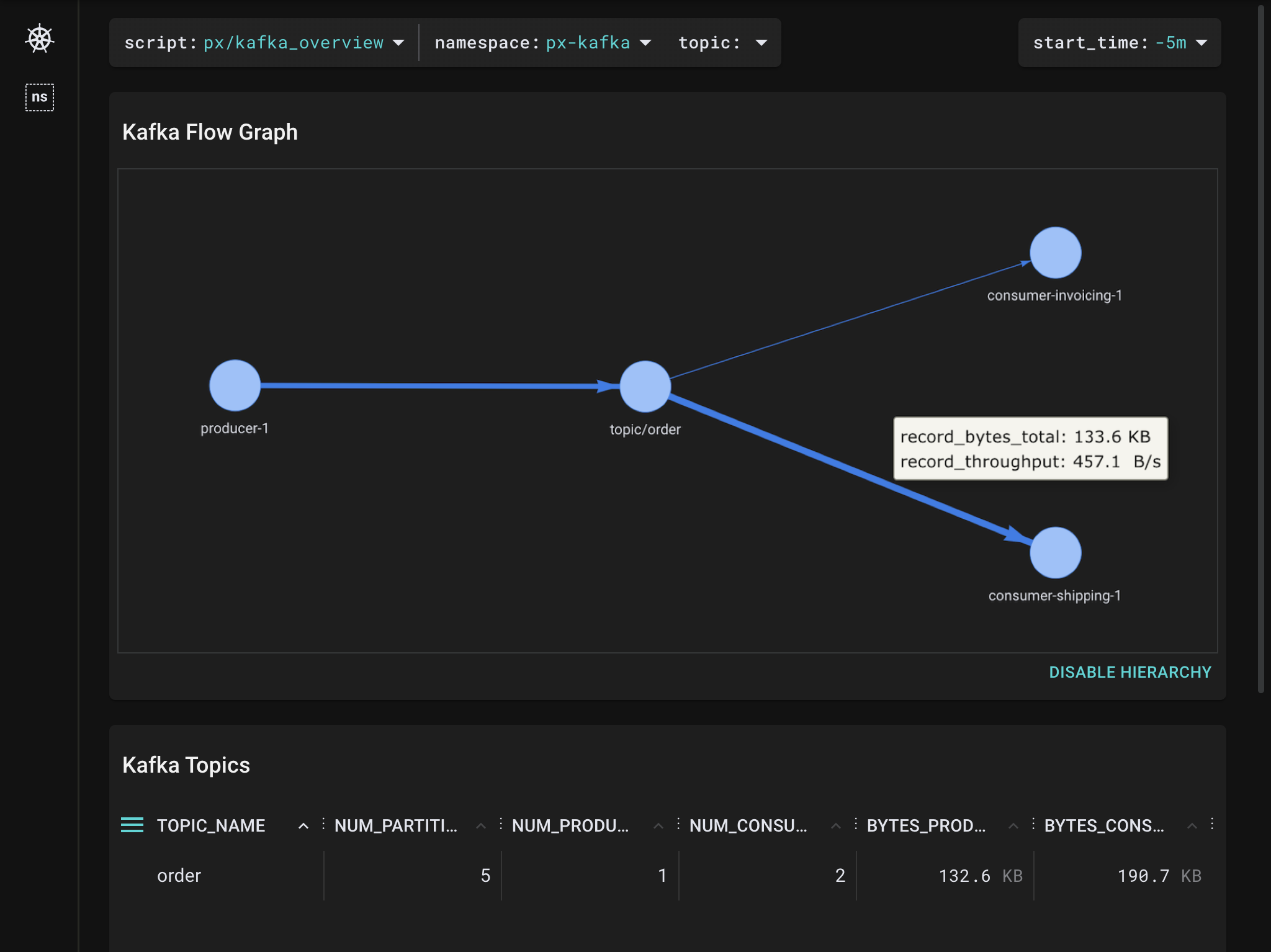 Let's use Pixie to see a graph of producers and consumers for each Kafka topic.