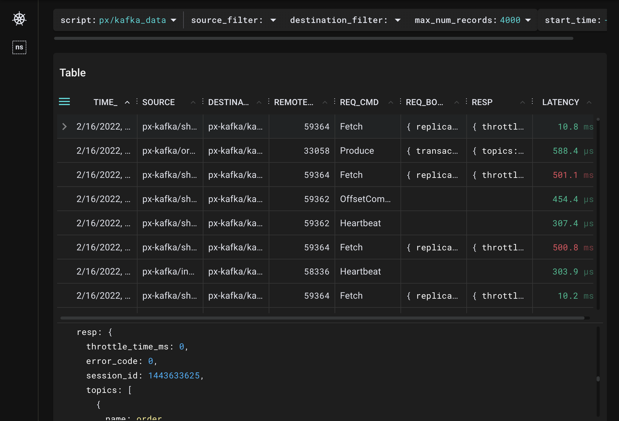 TIME_ column title to sort by time.We can see that there are multiple Kafka request commands being traced by Pixie, such as