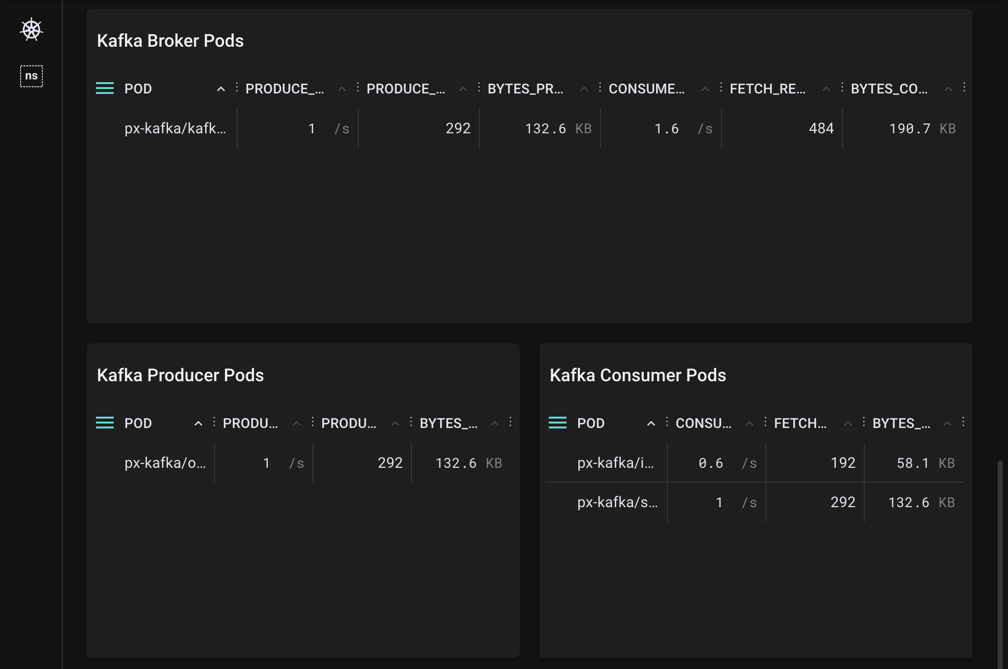 When debugging Kafka problems, you may want to check the health of the clients involved. Pixie makes it easy to switch between higher-level Kafka system metrics and the lower-level client infra metrics.