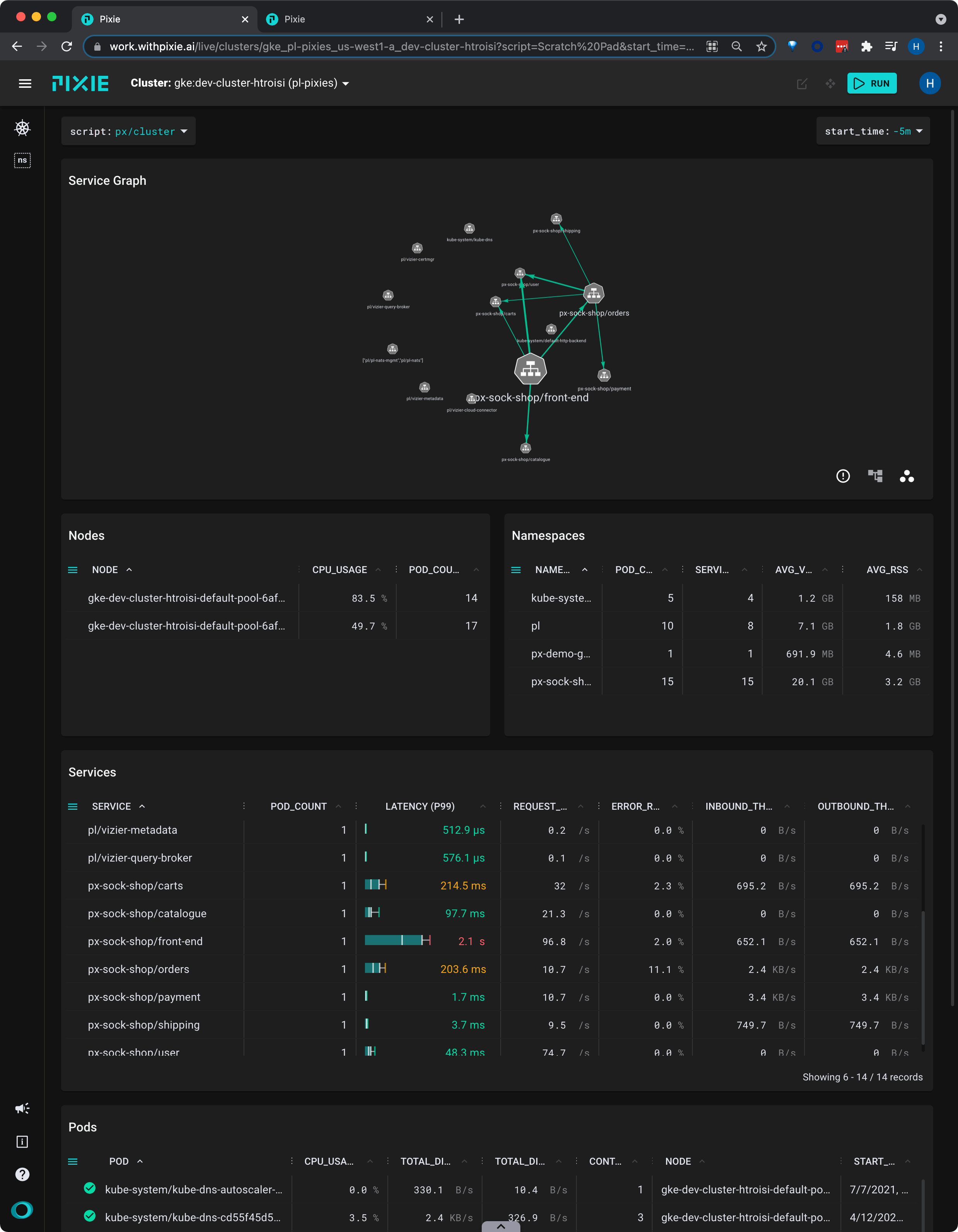 Pixie's UI makes it easy to quickly navigate between Kubernetes resources. Clicking on any pod, node, service, or namespace name in the UI will open a script showing a high-level overview for that entity.