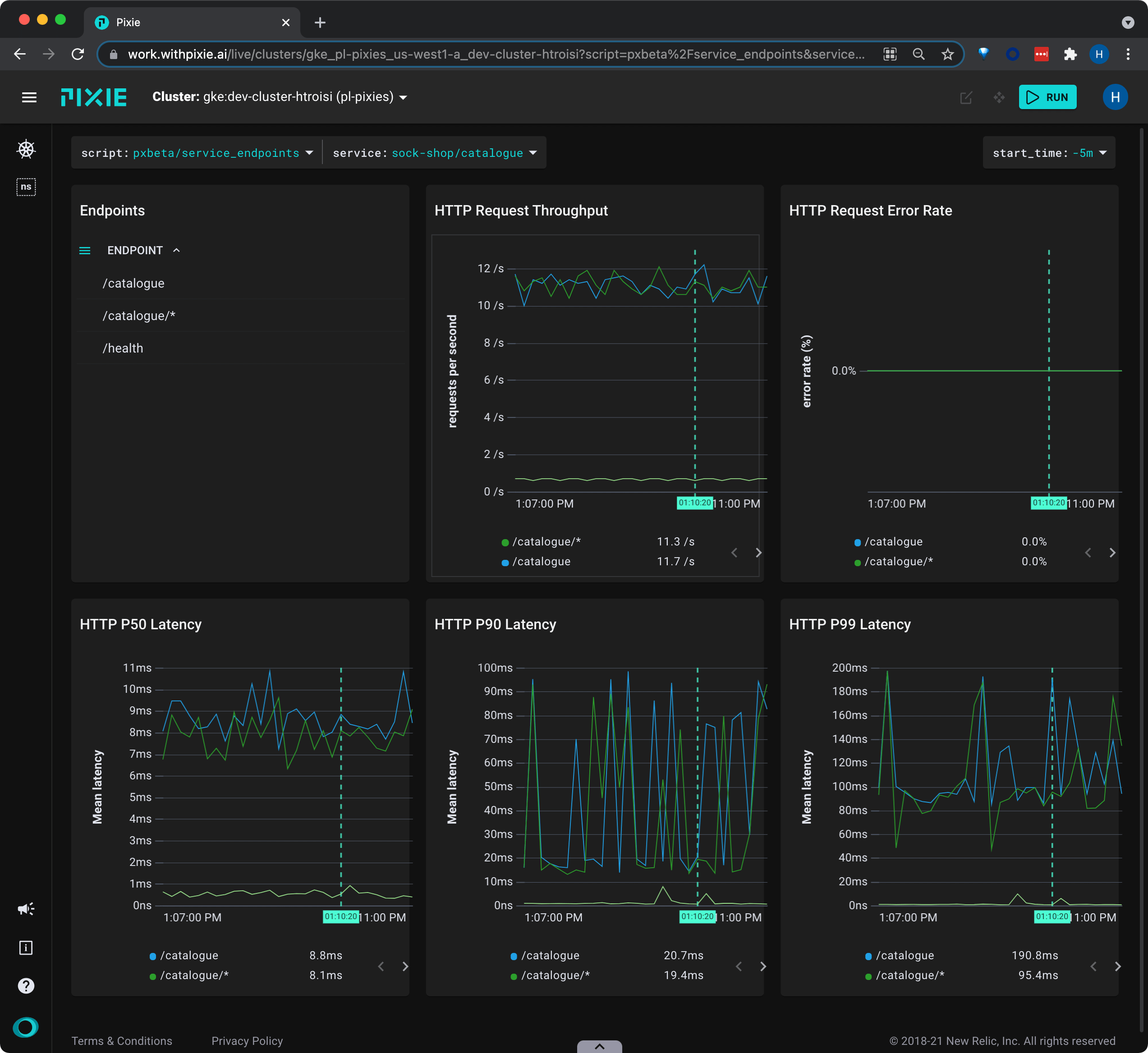 Select the drop-down arrow next to the service argument, type px-sock-shop/catalogue, and press Enter to re-run the script.