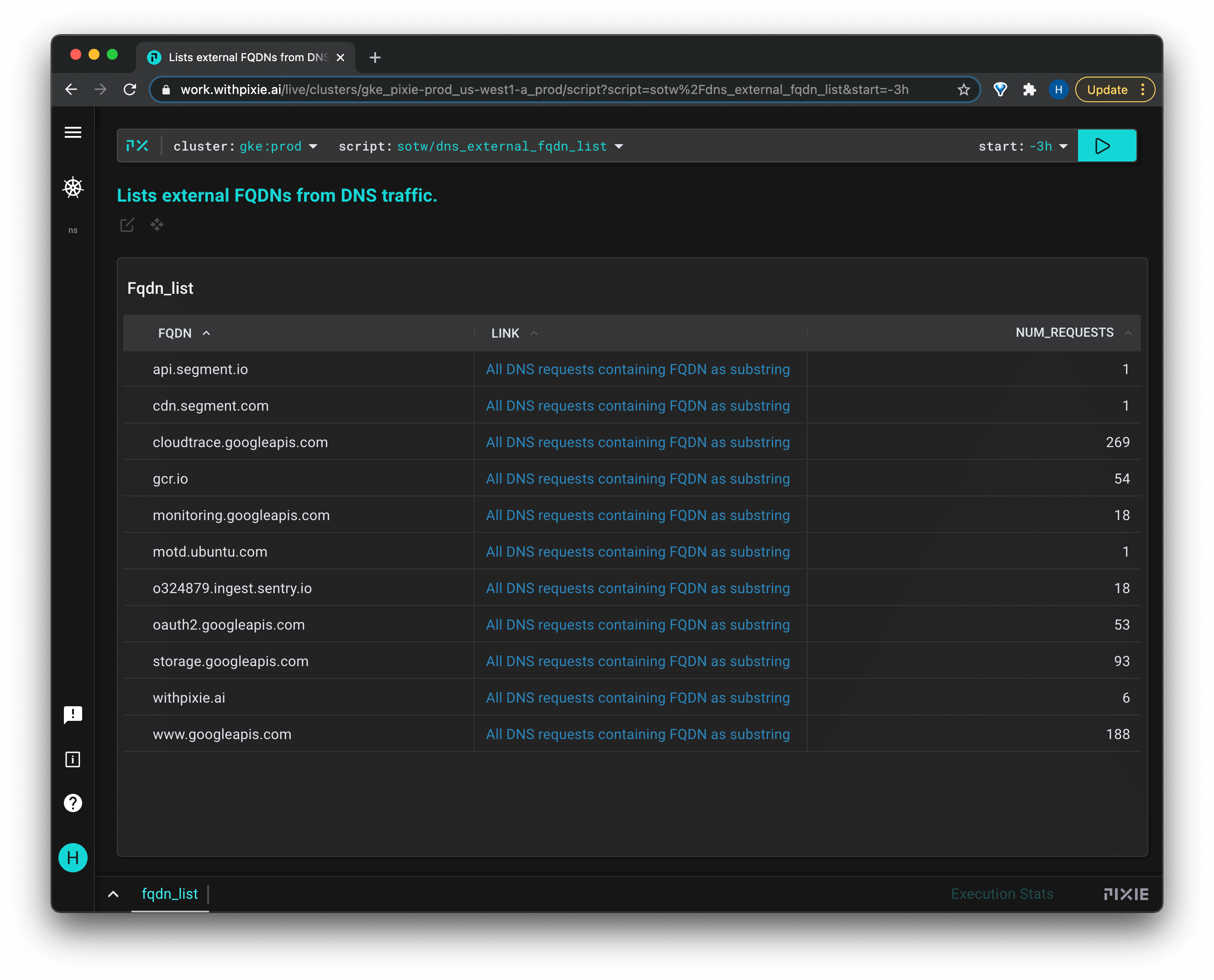 This script outputs a list of all of the external fully qualified domain names from successful DNS requests made in your cluster. Click on the "NUM_REQUESTS" column title to sort by number of requests per fully qualified domain name (FQDN).