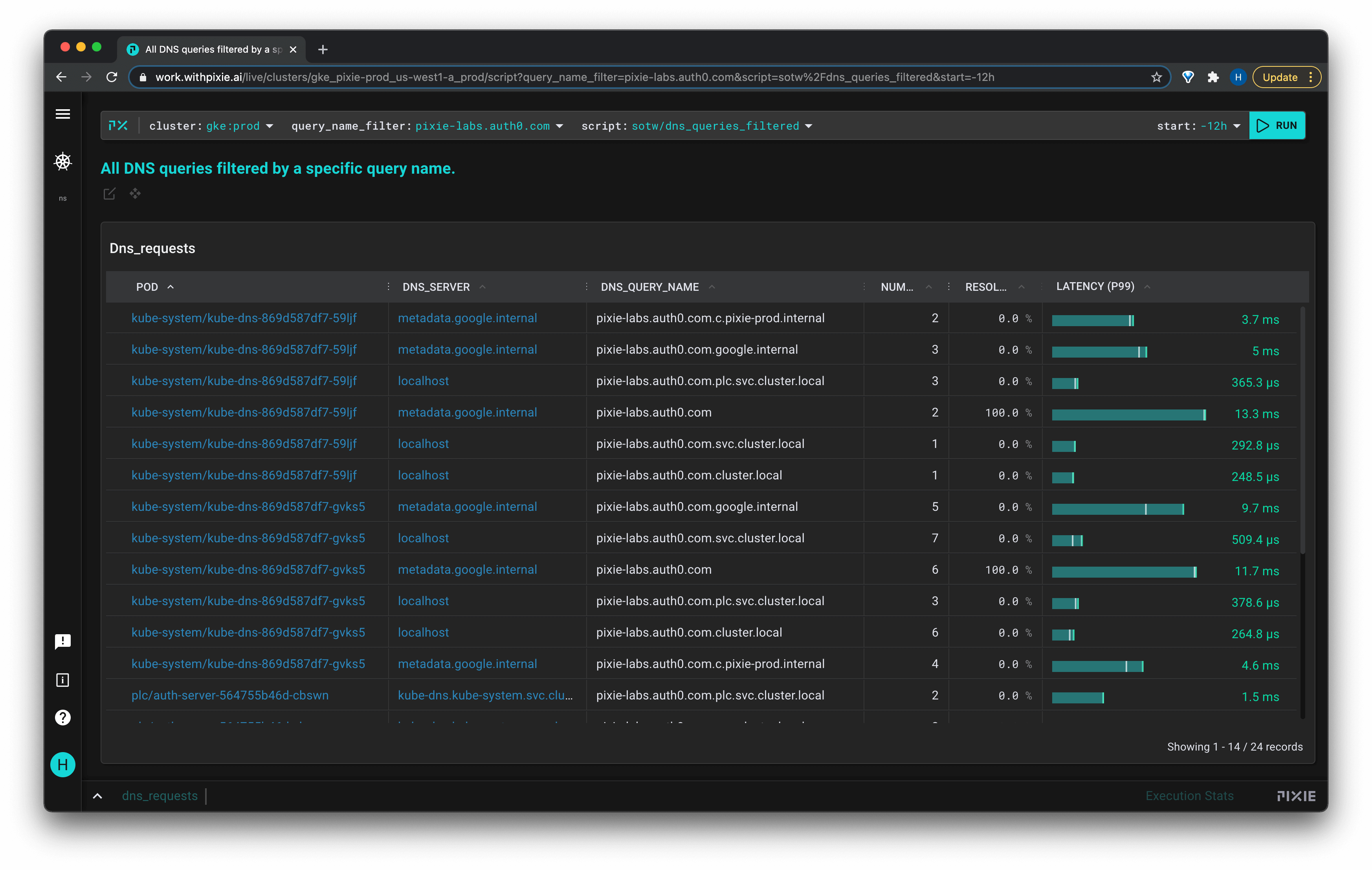Let's use Pixie to examine the DNS requests in your cluster and see the impact of any extraneous requests that are being made.